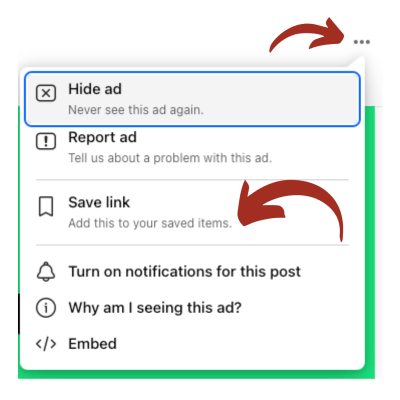 Where to start? When you see Home Buying ads on Facebook, save them, hit the three dots on the upper right corner of the ad and click “Save Link,” then create a folder for “Mortgage FB Ads” so you can reference them.